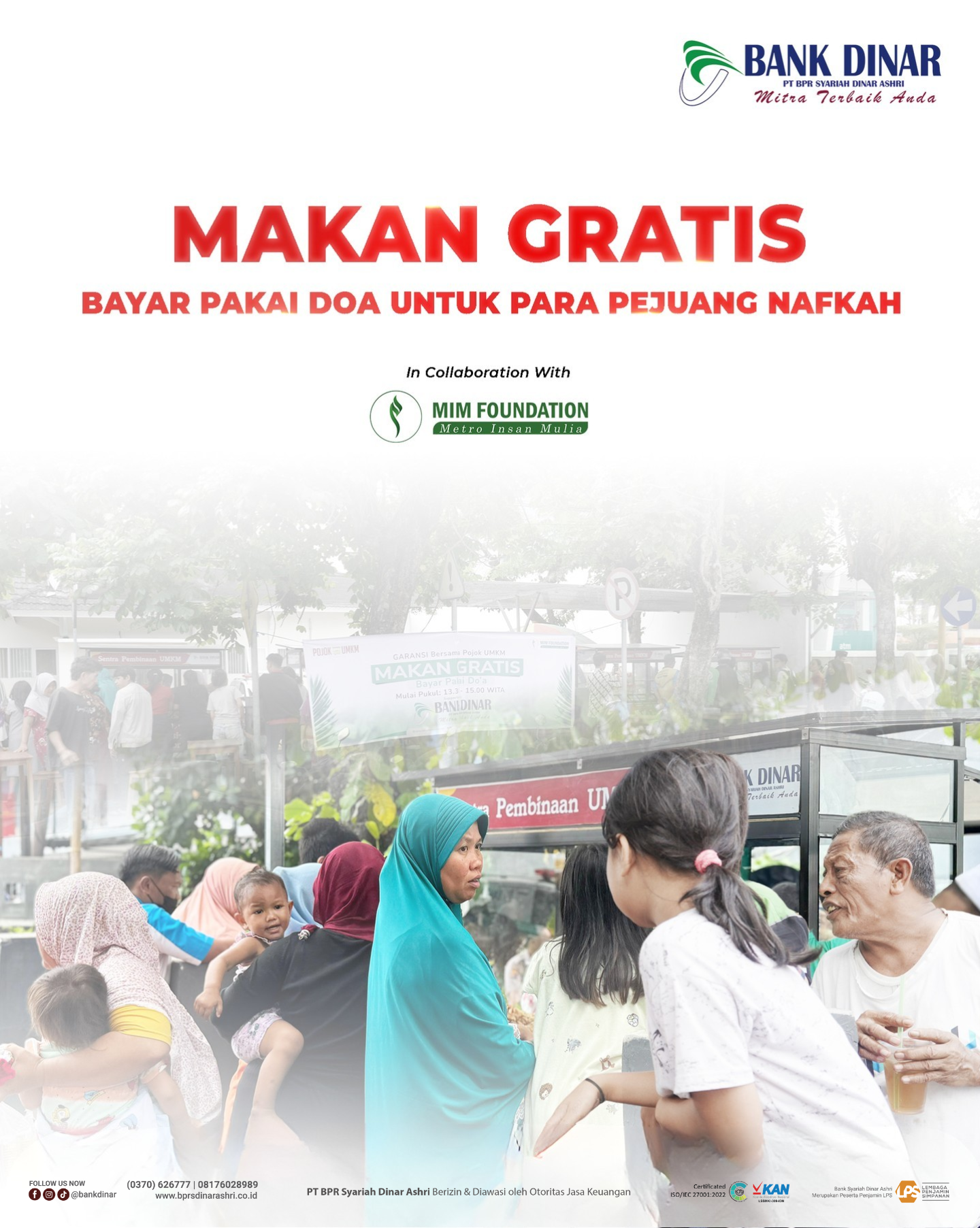 Bank Dinar mendukung inisiatif luar biasa dari MIM Foundation yang menghadirkan Program Makan Gratis Bayar Pakai Doa pada tanggal 6 September 2024. Acara yang berlangsung di Pojok UMKM, Centra Pembinaan UMKM Bank Dinar ini merupakan bentuk nyata kolaborasi dalam memajukan kesejahteraan masyarakat serta memberdayakan pelaku UMKM.