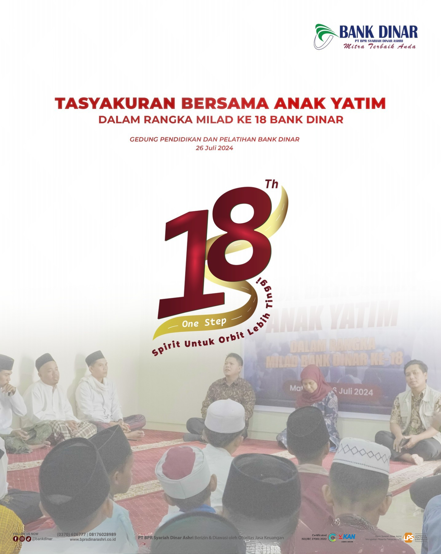 Mataram, 26 Juli 2024 – Dalam rangka memperingati milad ke-18, Bank Dinar mengadakan acara tasyakuran bersama anak yatim. Acara yang dilaksanakan di Gedung Pendidikan dan Pelatihan Bank Dinar ini merupakan wujud syukur atas perjalanan panjang dan pencapaian yang telah diraih oleh Bank Dinar selama 18 tahun.