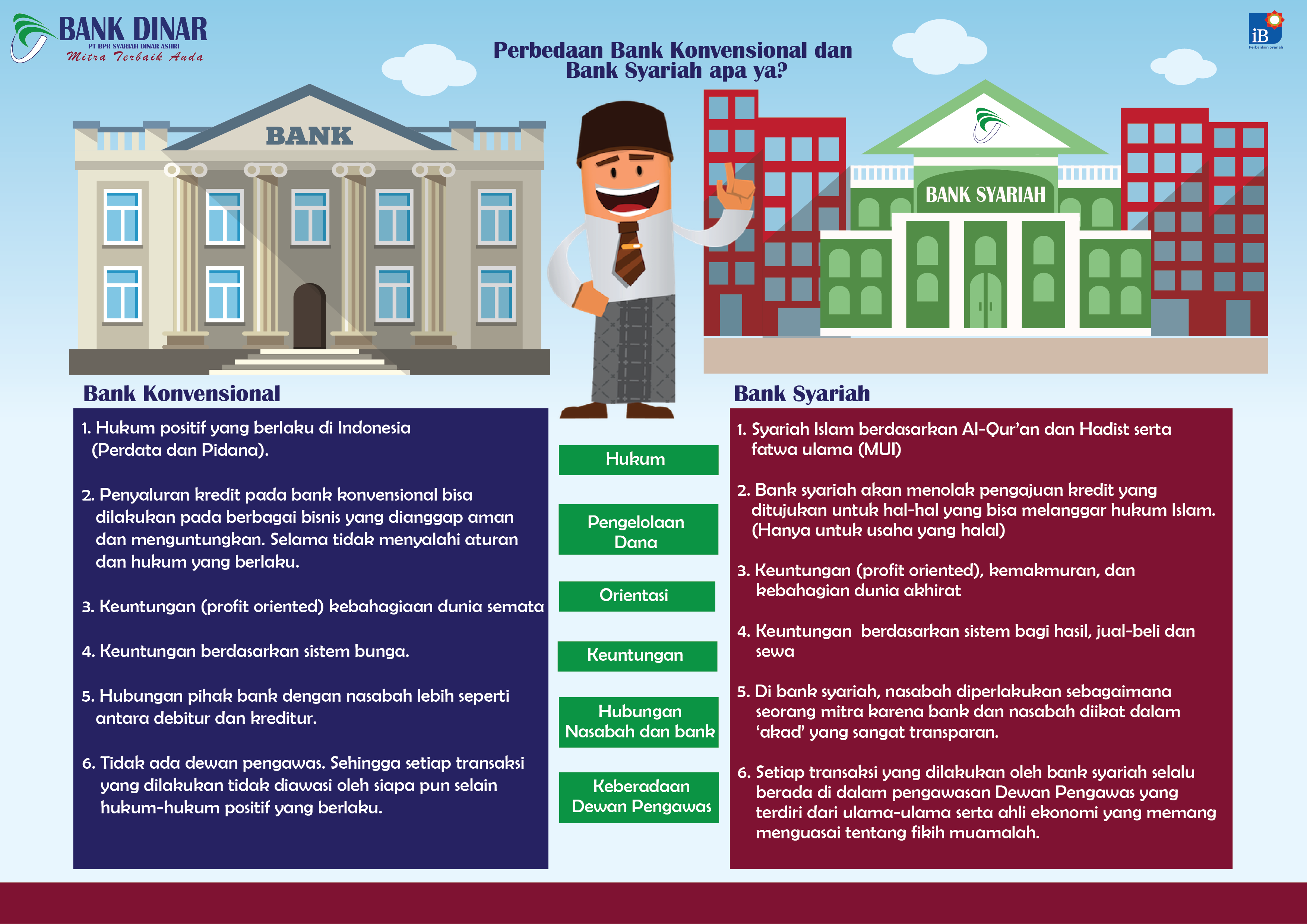 Apa ya perbedaan bank syariah dan konvensional?Perbedaan Bank Syariah vs Bank Konvensional :1. Hukum bank syariah berdasarkan syariah Islam berdasarkan Al-Qur'an dan Hadis serta Fatwa MUI (MUI) sedangkan bank konvensional hukumnya berdasarkan hukum positif yang berlaku di Indonesia (Perdata dan pidana) 2. Bank Syariah akan menolak pengajuan kredit... Read more