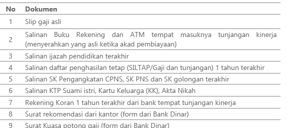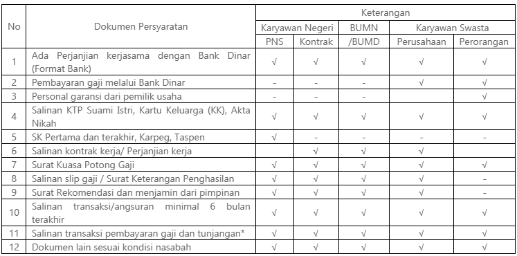 - Untuk pegawai yang pembayaran gaji dan tunjangan tidak melalui Bank Dinar wajib mengendapkan dana angsuran sebesar 2x angsuran atau sesuai kebijakan bank